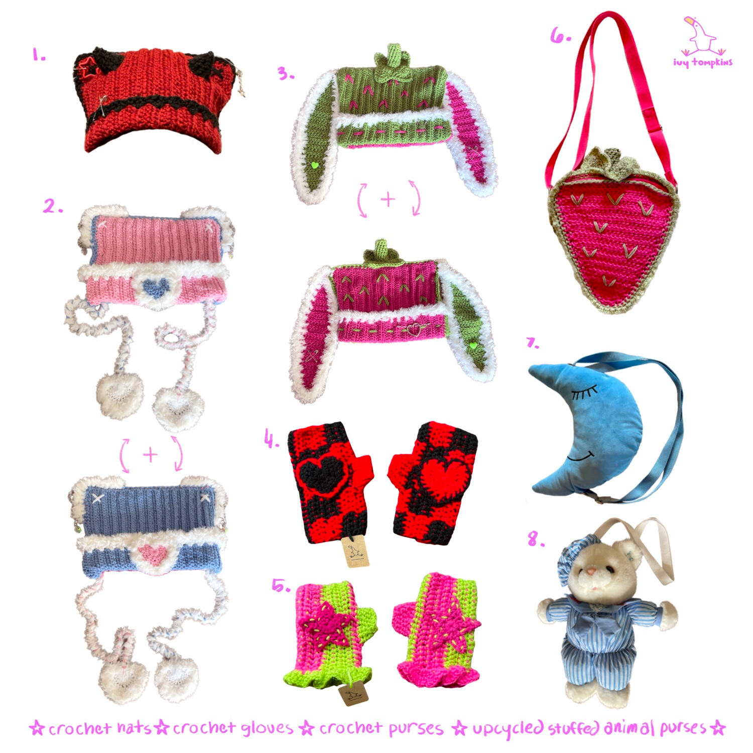 all my stuffed animal purses are created from thrifted stuffed animals! the first step is to throughly clean each animal and give them new stuffing. i then add the bag's lining and hand sew in the zipper. the final step is the strap, which i hand sew together and on to each bag with love and care :)